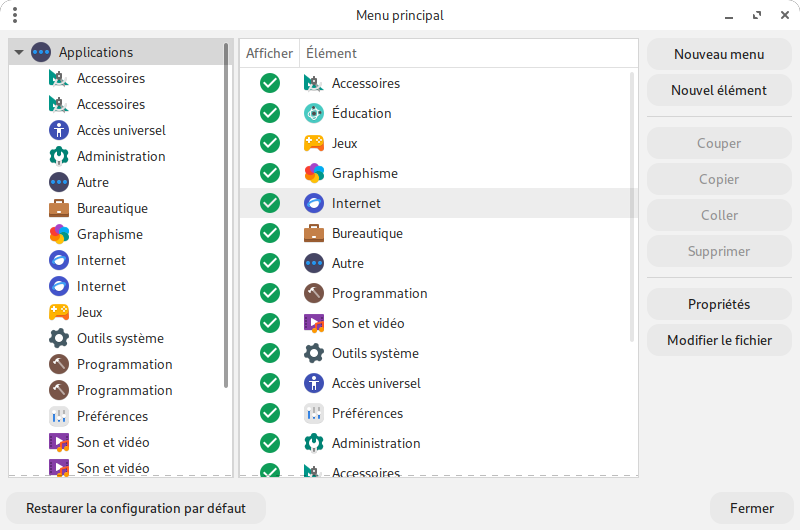 jlb a écrit : dim. 7 janv. 2024 20:47 D'ailleurs, qu'ajouter de plus, sinon la façon de réparer les doublons dans les rubriques ou les lanceurs du menu, en cas d'interférence entre "alacarte" et "menulibre ("Menu principal" et "Éditeur de menus) ?