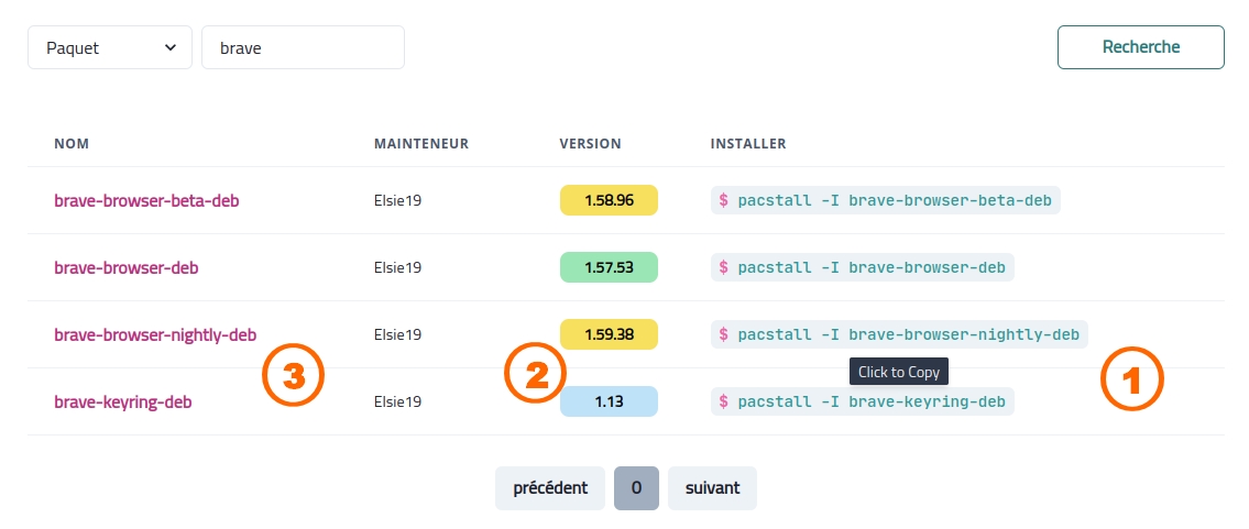 • connaître la version du paquet et son évolution (2) ou consulter la page consacrée à l'application (3) pour vérifier ses dépendances ou son pacscript sur GitHub. (2)