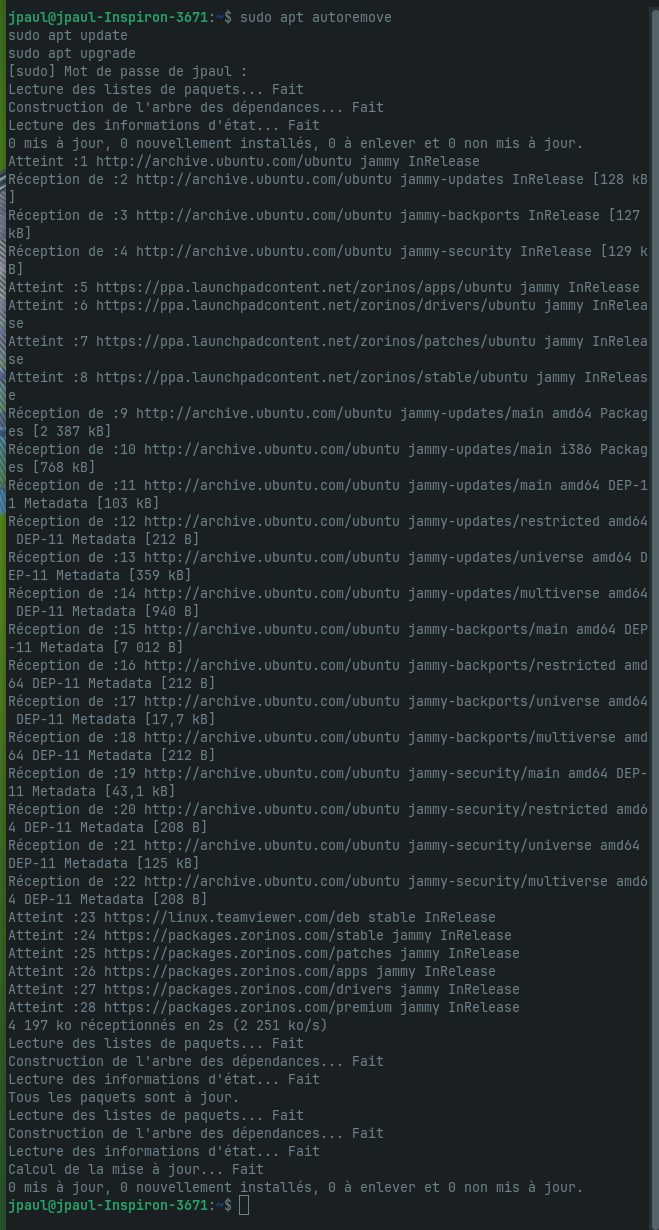 Certes, il est probable que cette "mésaventure" finisse par une réinstallation de Zorin ! (ça ne me pose pas de problème, juste un peu de frustration) ... ça c'était ma première idée !... mais comme je suis curieux et obstiné, je me suis dit que je devais au moins, tenter les 3 lignes de commandes suivantes ... que vous m'aviez suggéré !