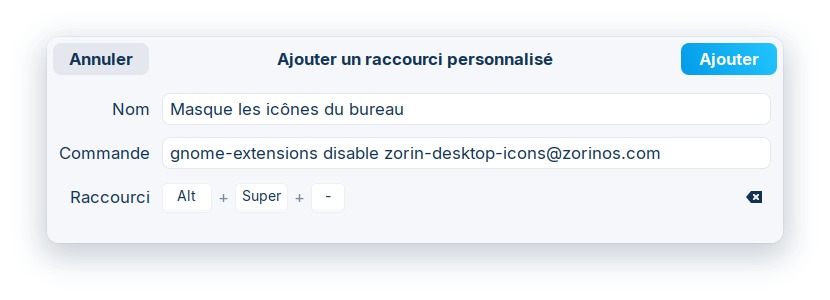 Puisque les icônes sont affichées sur le bureau, nous commencerons par créer le raccourci clavier qui les masquera :