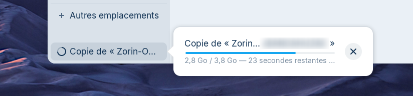 Oui, il existe une barre d'avancement, mais dans la version de Nautilus de Zorin 18, il faut la chercher tout en bas du volet gauche :
