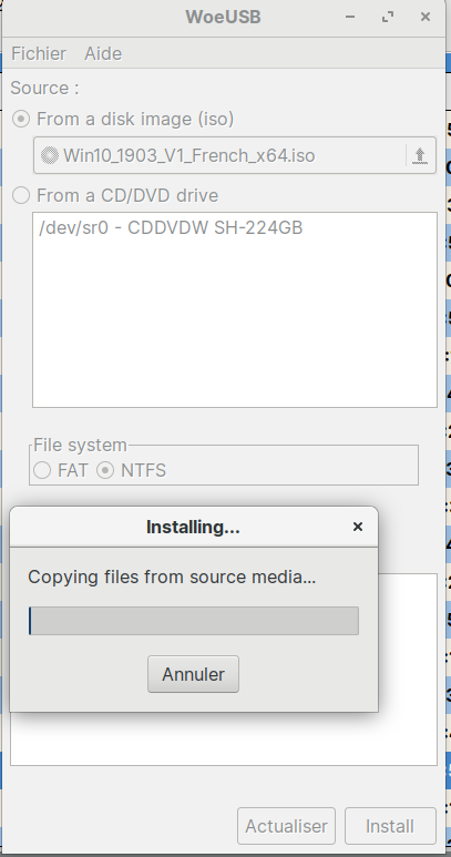 Par contre, le processus de nettoyage s’étant bloqué, il faut faire : Alt+ F4 pour fermer la fenêtre  de WoeUSB et redémarrer le PC. Et ensuite, effacer en root dans media > woeusb_source_xx et woeusb_target_xx
