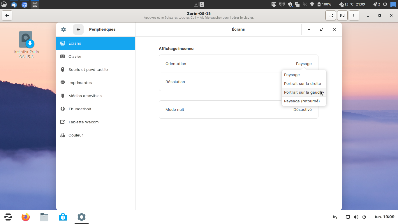 Bonjour à tous, je reviens vers vous car je suis possesseur d'un pc hybride ( CHUWI UBOOK) et je n'arrive à trouver la méthode pour orienter l'écran je suis sur la 15.3 Core, il y a quelque temps de cela j'avais touvé dans une version ZORIN qui avait : dans paramétre-écran-orientation ( avec une posibilité :paysage, orientation à droite ou gauche ) juste au dessus de résolution, cette option semble avoir disparue, c'est bête car tout fonctionne correctement ( tactile, wi-fi, etc ) , mais avoir un écran à l'horizontal et devoir pencher la tête à droite ou gauche c'est pas génial.......