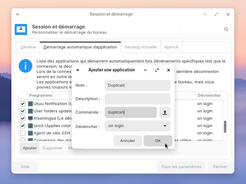 - Version Lite : Paramètres > Système > Session et démarrage > Démarrage automatique d'applications