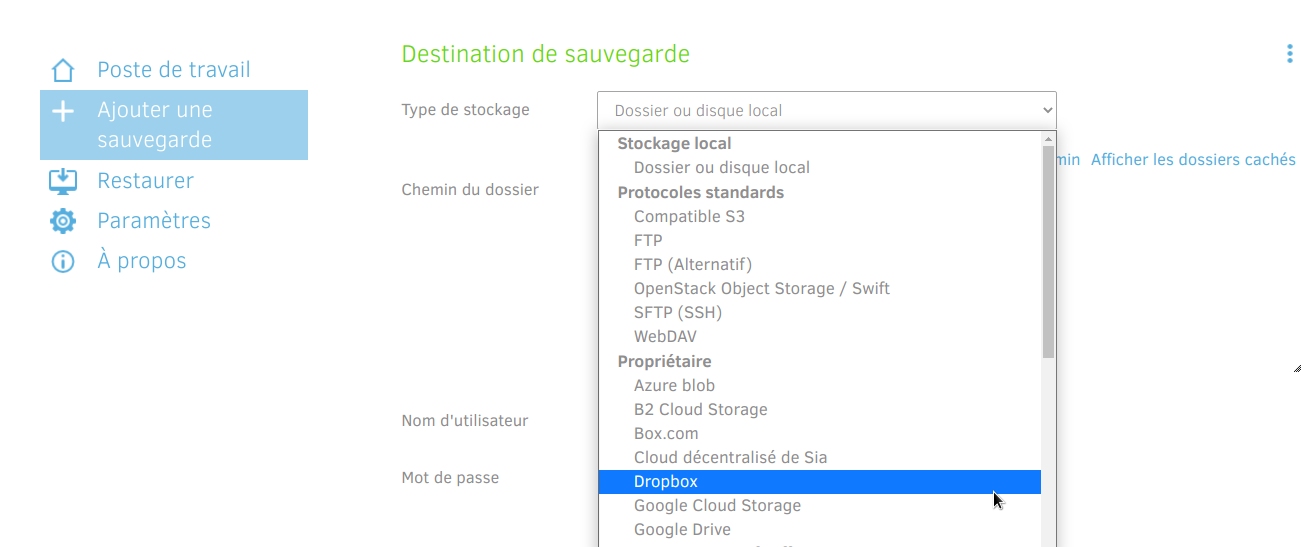 Duplicati permet de faire des copies de sécurité (cryptées ou non) sur votre ordinateur, par FTP, WEBDAV, ou dans une vingtaine de "clouds".