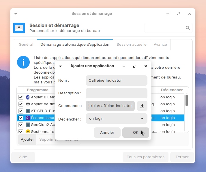 sudo apt install caffeineAjoutez cet indicateur à la liste des applications au démarrage :