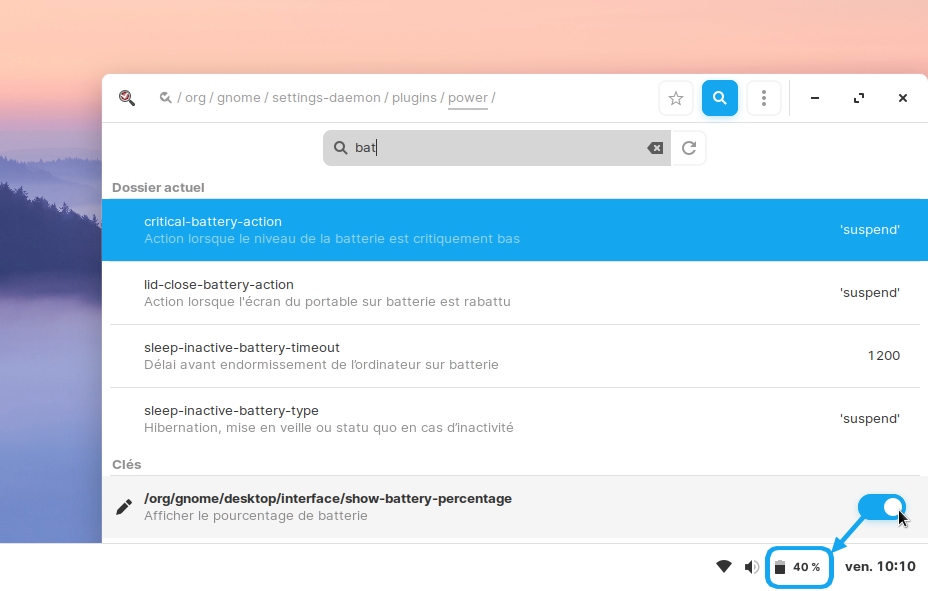 C'est, sûr... Si vous avez installé Dconf Editor, il suffit de taper "bat" pour trouver le bouton à glissière qui va bien, ainsi que toutes sortes d'autres réglages :