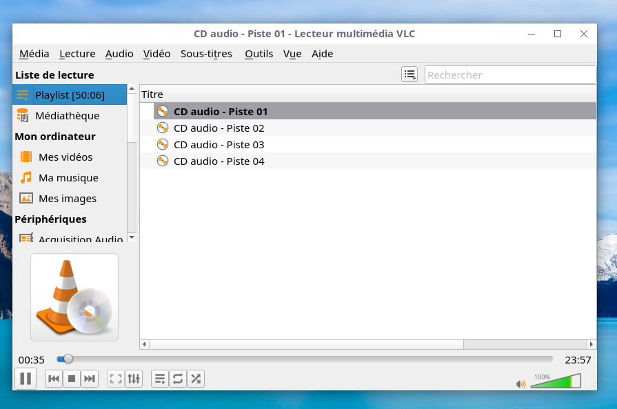 jlb a écrit : ven. 14 oct. 2022 10:17 Mais lancer VLC, puis "Média > Ouvrir un disque... > CD audio > Lire", ça fait cinq clics — comme dirait @roger :poufe: — et c'est vite fastidieux quand on a hérité comme moi d'une grande collection de CDs à trier...