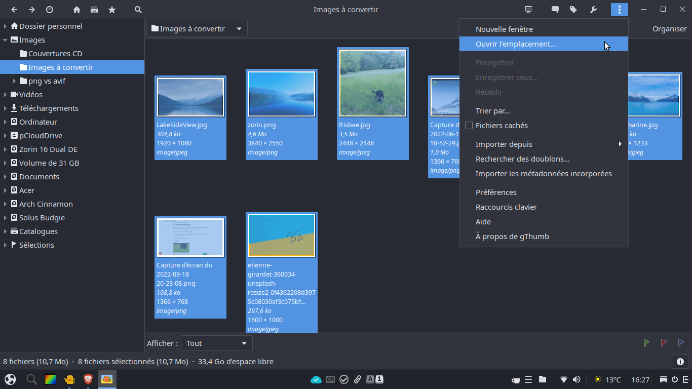 Si vous ne l'avez pas, commencez par installer gThumb, le gestionnaire d'images pour Gnome qui est un des premiers à intégrer le format AVIF — au-delà de ce test, vous ne le regretterez pas.