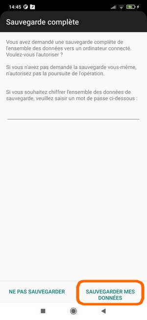 ... puis j'ai accepté le débogage USB et, après connexion du téléphone au moment précisé par la page, la sauvegarde s'est faite sans problèmes avec cette commande (ça, c'est le terminal qui me l'a expliqué) :