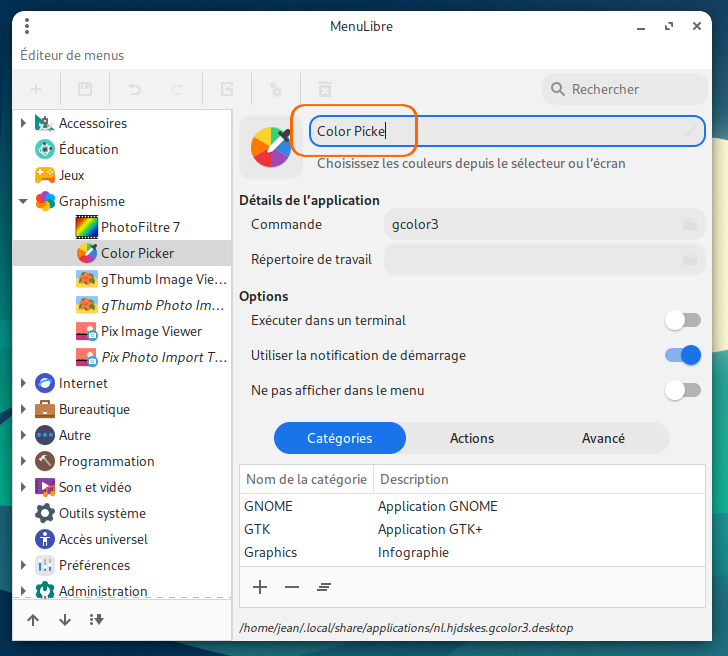 Résolu pour ma dernière interrogation, en fait le chemin indiqué en bas correspond au nom de la catégorie sélectionné sur la gauche (dans l'image "Mon web") crée avant que j'installe Menu Libre.