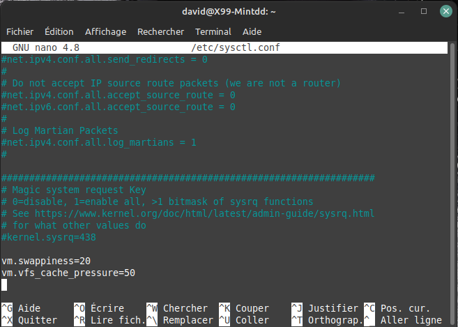 sudo nano /etc/sysctl.confTu rajoutes tes deux lignes tout en bas de ton fichier.
