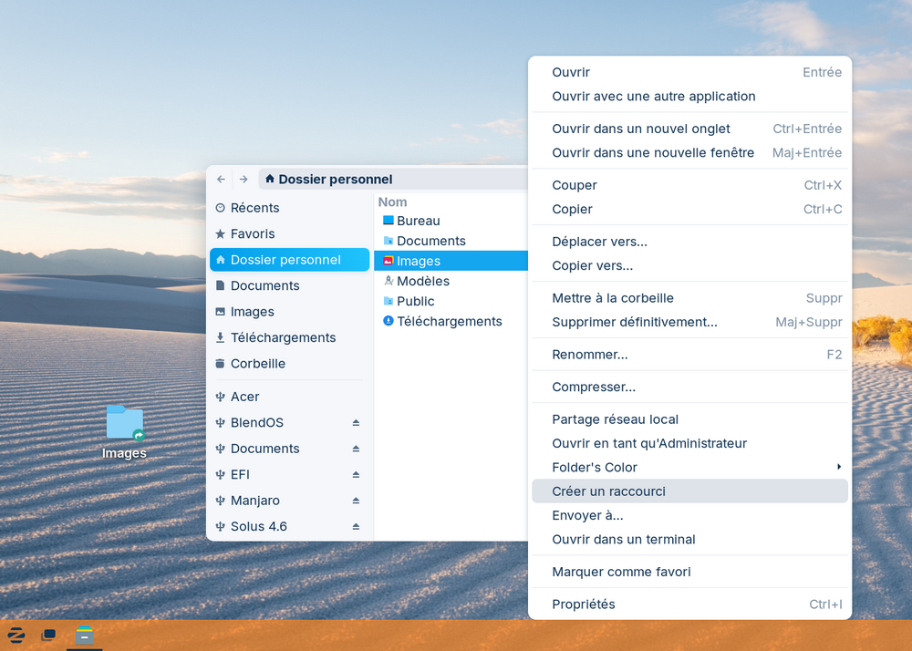 Lorsque vous ouvrirez Nautilus, l'option "Créer un raccourci" se sera ajoutée au menu contextuel (clic droit), vous permettant de... créer des "raccourcis" — au sens où Windows les a popularisés — à partir de fichiers ou de dossiers :