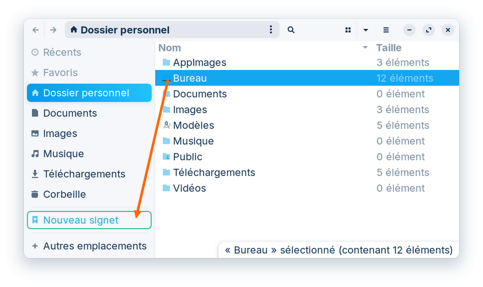 Pour pallier cette absence, il suffit de créer un "signet" depuis le répertoire personnel en glissant le "Bureau" dans la partie basse du volet latéral de Nautilus, comme ceci :