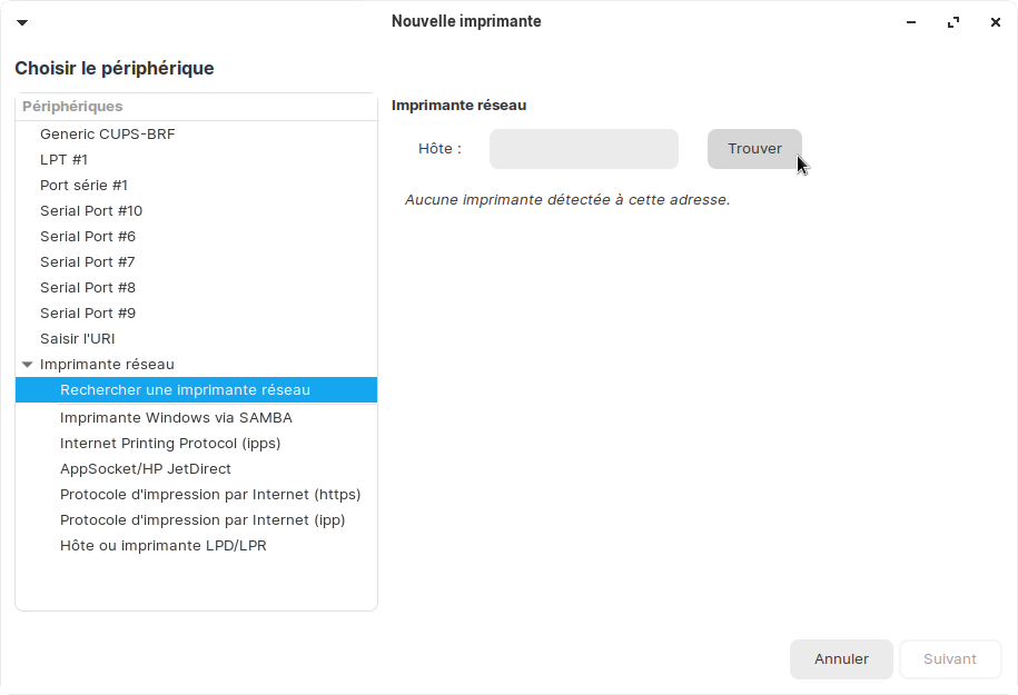 Vous n'allez pas le croire mais je n'ai pas avancé d'un pouce ! J'ai appris beaucoup de choses sur Linux, les dépôts, les paquets, des tas de commandes intéressantes, etc. mais je bloque toujours au même niveau. À savoir où trouver l’adresse du réseau wifi et l’adresse IP attribuées à mon imprimante…Dans la fameuse fenêtre « Printing troubleshooter », je ne sais pas compléter :
