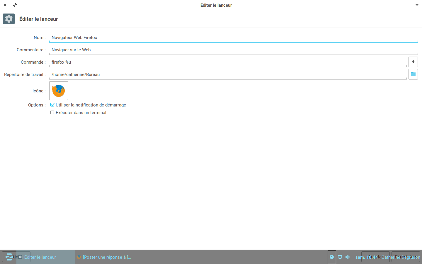 - application > internet > navigateur Web Firefox puis clic droit. Cela m'ouvre la fenêtre "Editer un lanceur". Je met le bureau comme répertoire de travail comme sur la capture suivante (