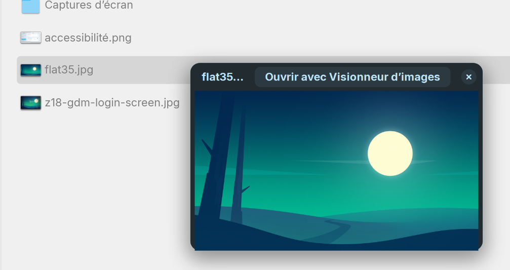 Cliquer sur une icône d'image (ou d'un autre type de fichier, même audio ou vidéo), puis appuyer sur la barre d'espace pour afficher son aperçu, par exemple :