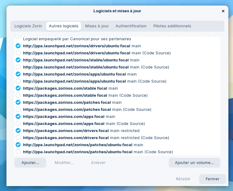 Je suis sur Zorin 16, mais, si les adresses sont différentes sur Zorin 15 ("bionic" au lieu de "focal"), je pense que le principe est le même.