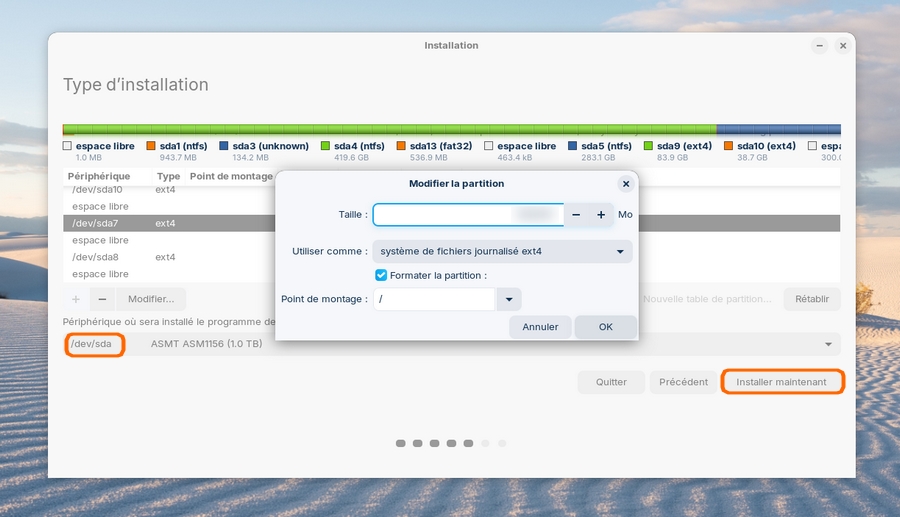 Tapez "gp" dans la boîte de recherche du menu principal et lancez le gestionnaire de partitions GParted : vous aurez une vision beaucoup plus claire qu'avec celui de l'installateur.
