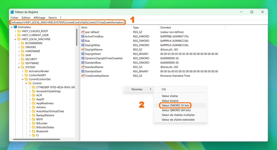 La première bonne nouvelle, c'est que l'éditeur de registre s'ouvrira directement à la rubrique "TimeZoneInformation" si jamais vous vouliez remettre la valeur de la clé à "0" ou carrément la supprimer.