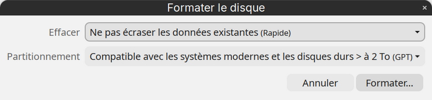 - Dans le menu "Big Mac" (trois points) en haut à droite du panneau principal, clique sur "Formater le disque" et sélectionne ces deux options :