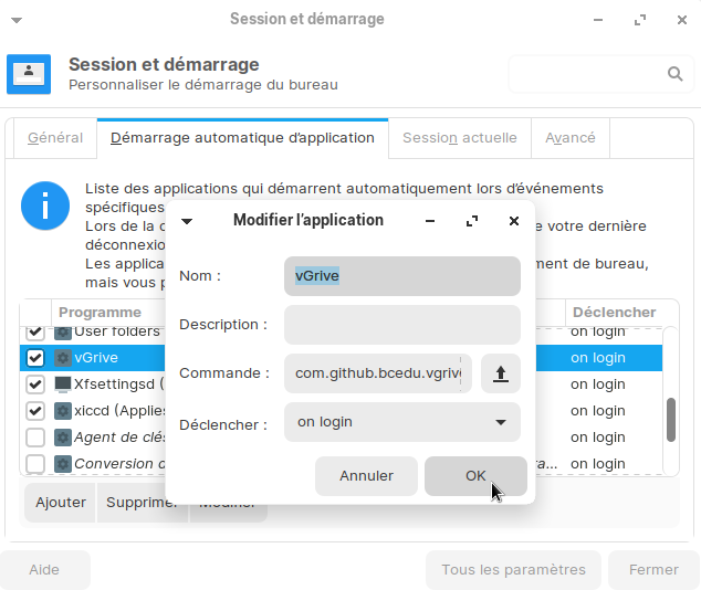 Mais quand on l'ajoute aux applications au démarrage (com.github.bcedu.vgrive) ...