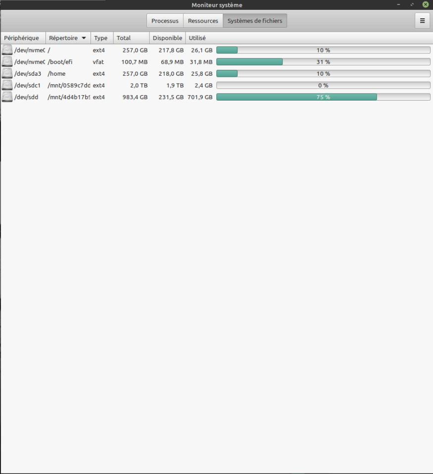 j'aurais aimé savoir si il existe une alternative linux à la représentation graphiques des DD sur windows. Je m'explique (je suis sur XFCE mais cinnamon et Gnome il y a trois ans quand je les avais essayé ne le faisait pas non plus), sur windonws lorsque l'on va dans le dossier ''ce PC'' aka ''poste de travail'', on trouve nos disques dur avec C:, D: comme sur linux lorsque l'on va a la racine du gestionnaire de tache. sauf que dans Windows il y a une petite barre qui affiche de manière graphique le remplissage du disque et vire au rouge si il est presque plein.