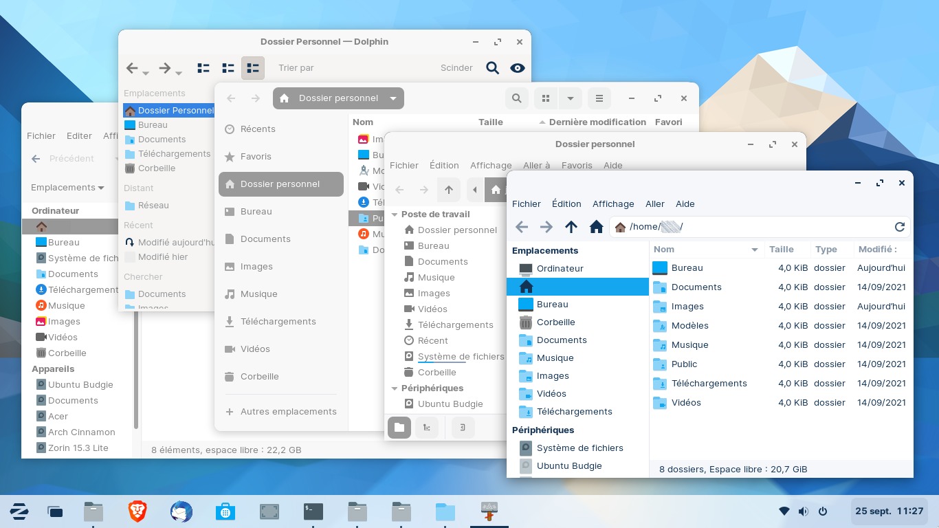 De gauche à droite : Caja (MATE), Dolphin (KDE), Nautilus (Gnome), Nemo (Cinnamon), Thunar (Xfce).