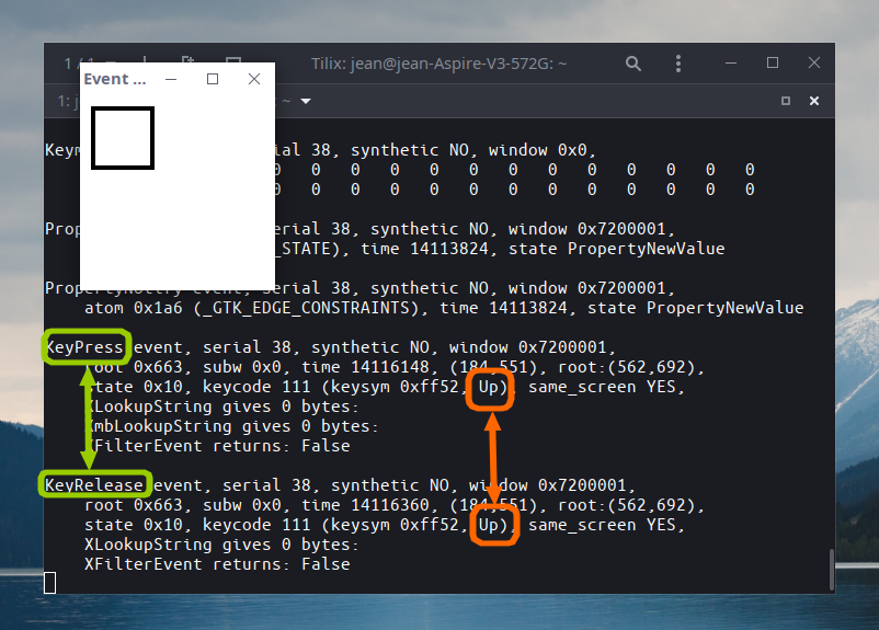 On constate au passage que le moniteur a enregistré deux états de la touche, vu que je l'ai pressée puis relâchée. Dans certains scripts "xdotool", cela peut avoir son importance de le préciser.