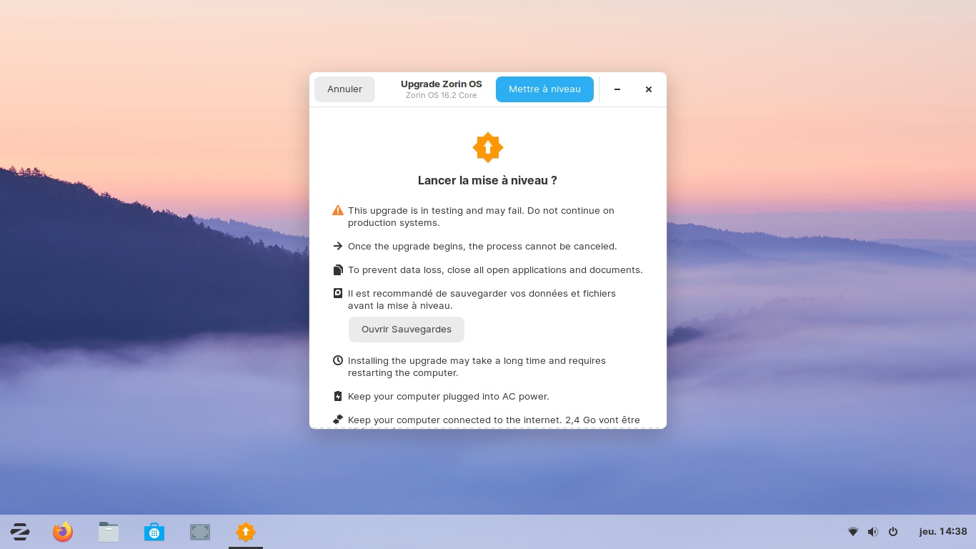 Il semblerait toutefois que les Zorin brothers aient pris la question au sérieux puisqu'une application dédiée, Upgrade Zorin OS, est désormais disponible dans les dépôts (à partir de Zorin 15).