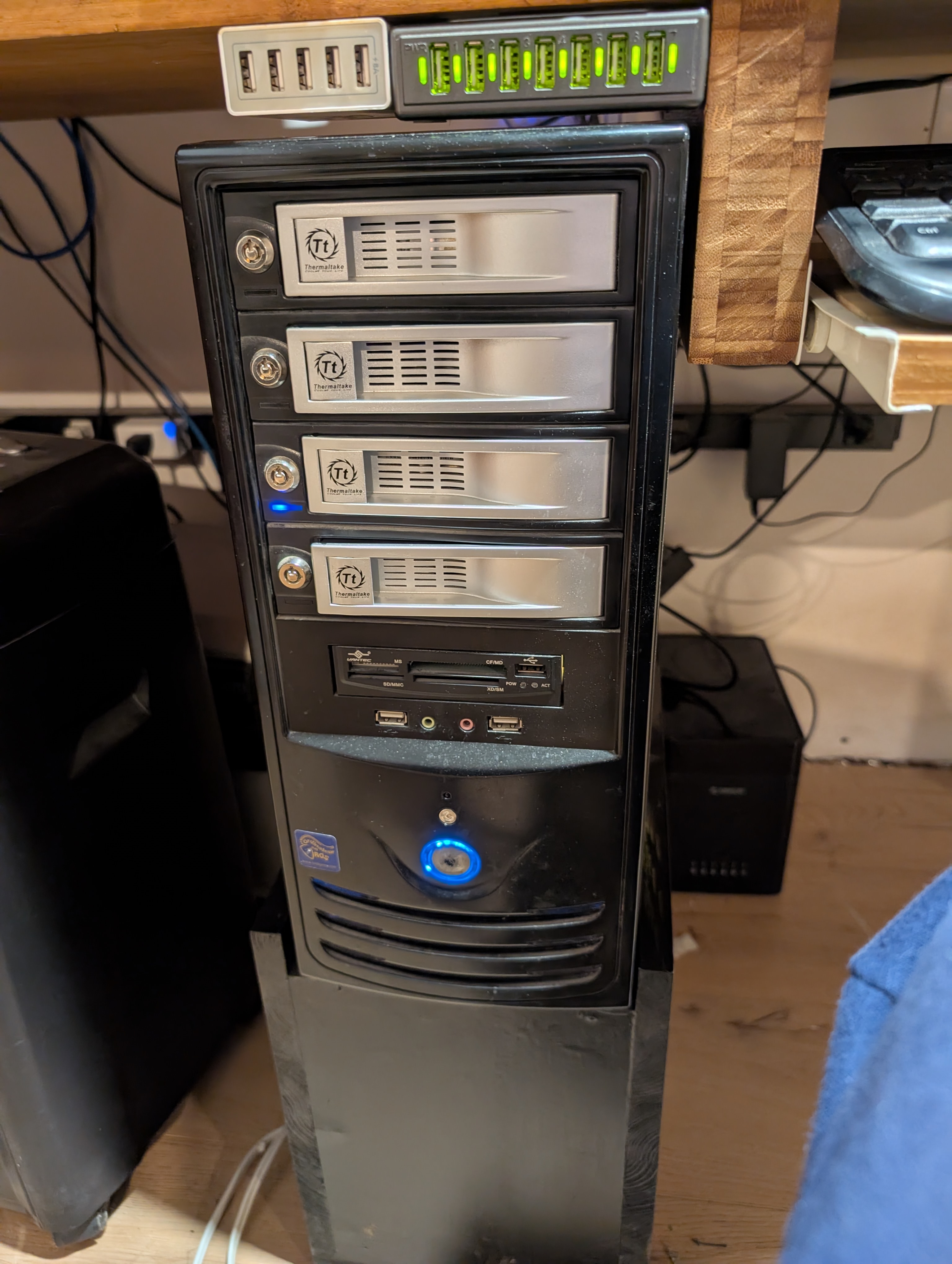 Attention tout de même... la "Tour" est installée sur un podium. elle fait 41 cm de haut, et pas 71 comme semble le montrer l'image. Dans le podium, par l’arrière, j'ai un boitier Orico 5 disques, branché à mon PC via USB3, dans lequel il y a quelques disques pour les archives, et autres trucs que je n'utilise pas à tout les jours...