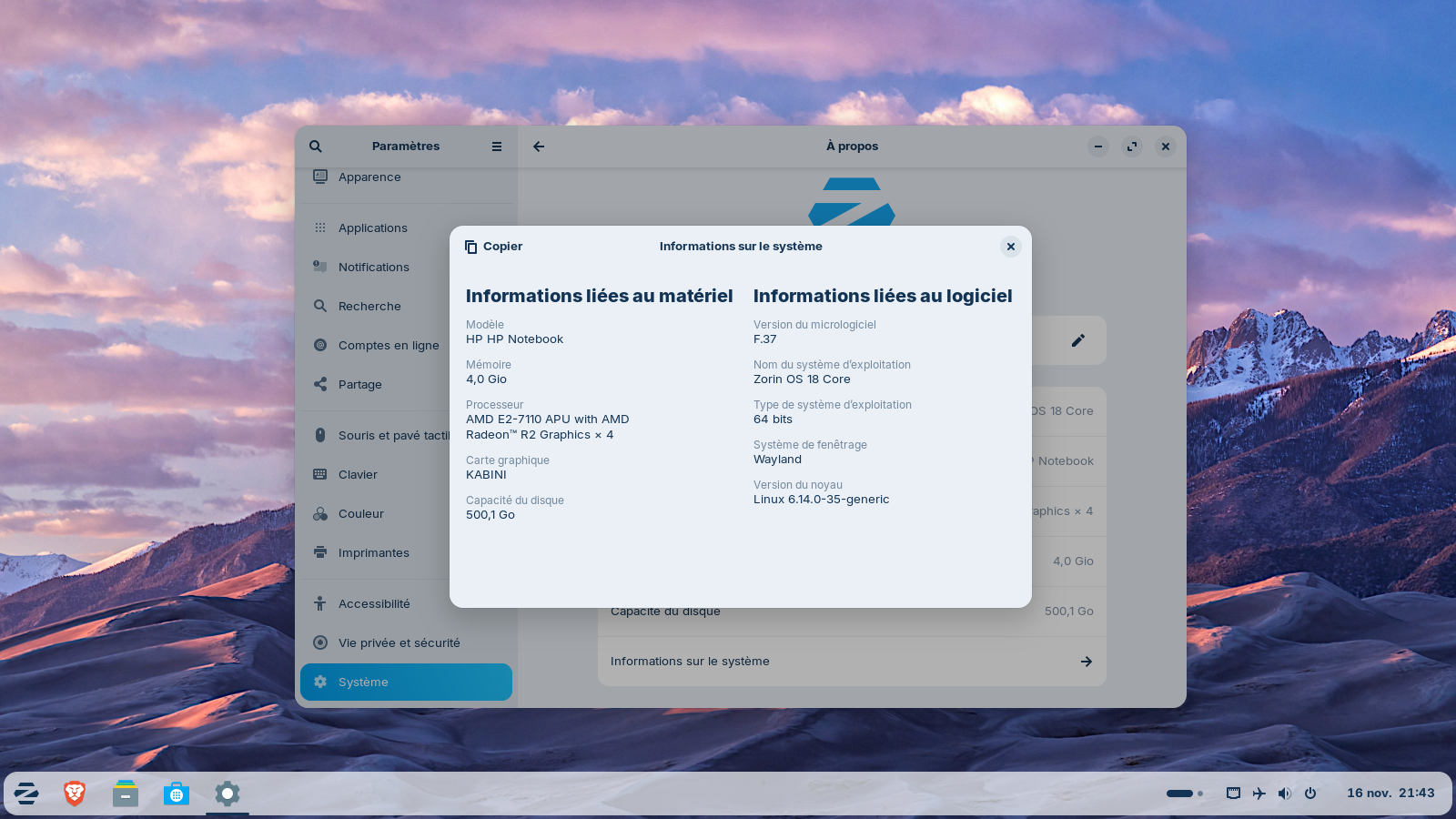 J'ai essayé d'envoyer une capture d'écran de mon système mais je ne sais pas si j'ai réussi.