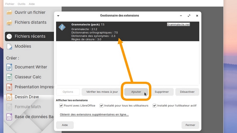 ​​​​​​​L'explication et d'autres conseils intéressants sur la page de téléchargement de Grammalecte ("Notes concernant l'installation") : https://grammalecte.net/#download