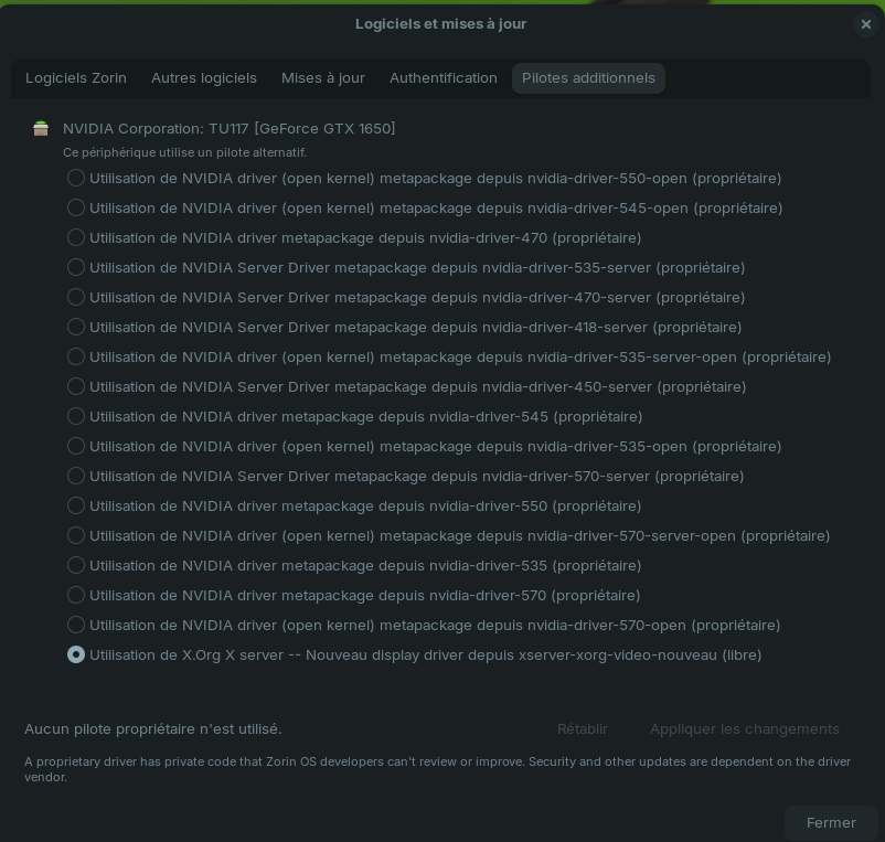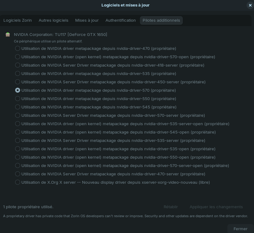 "Logiciels et mises à jour" propose toutes les versions disponibles du pilote, mais c'est uniquement par rapport à la version 22.04 d'Ubuntu de Zorin 17.2, pas par rapport à ton ordinateur et encore moins à ta carte.