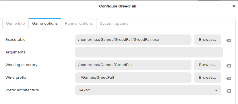 Allez dans la configuration du jeu > Game options Wine  prefix > Browse et cliquez sur votre dossier de jeu .GreedFall . Cliquez sur Save