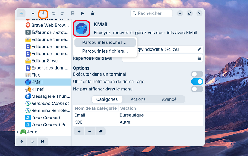 Remarque : Si on ne veut pas modifier l'icône de l'application dans le menu principal, rien n'interdit de rechercher le nom de l'icône grâce à "Éditeur de menu" et de modifier le raccourci bureau en utilisant la première méthode.