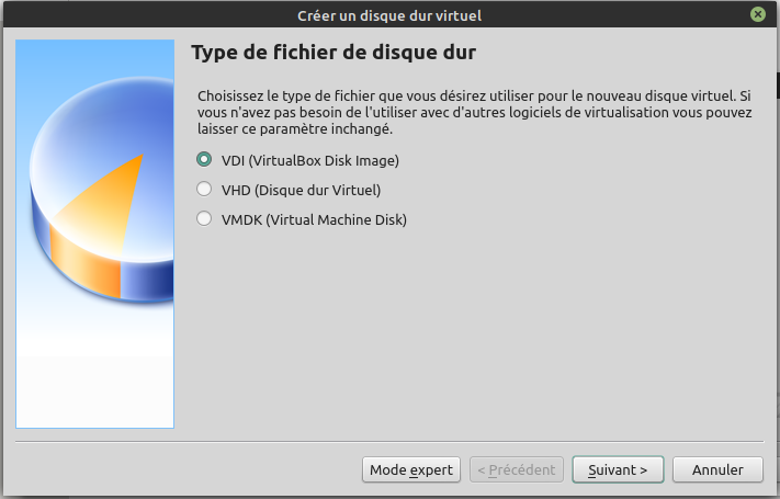 Etape suivante Type de fichier de disque dur, il n'y a d'intérêt à changer le paramètre par défaut que si vous utilisez plusieurs logiciels de virtualisation, ce qui n'est pas le cas pour l'instant !