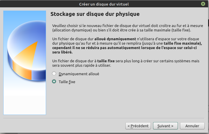 Choix important, car il va aussi conditionner les performances de votre machine virtuelle, le Stockage Dynamique ou Fixe. Vous pourrez le lire et/ou le constater par vous-même, mais il vaut mieux choisir une Taille fixe, votre machine sera je le rappelle plus lente qu'une vraie machine donc si vous demandez en plus à votre logiciel de virtualisation de calculer en permanence la taille de votre disque dur, cela ne fait que ralentir encore plus votre machine.