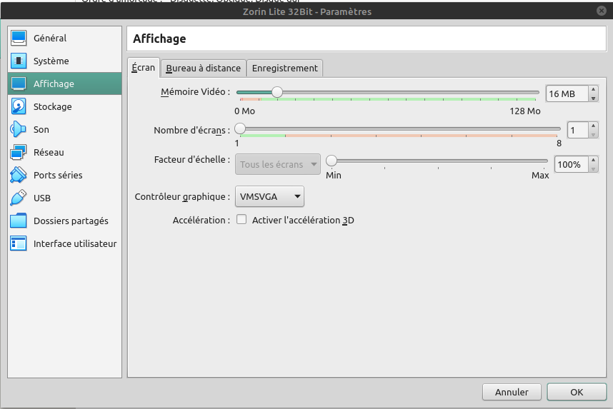 Affichage : je vous conseille de mettre le maximum de mémoire vidéo possible, mais vous pourrez changer ce paramètre si cela fait ralentir votre système de base. Et j'ai l'habitude de cocher Activer l'accélération 3D. Pour le nombre d'écran encore une fois c'est à vous de choisir.