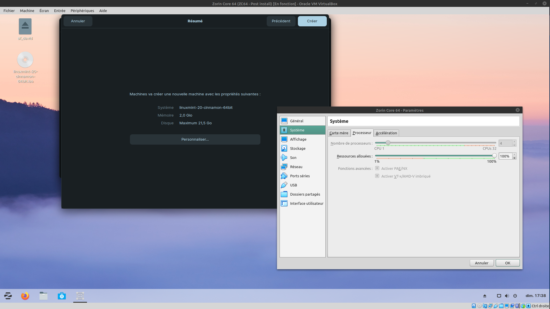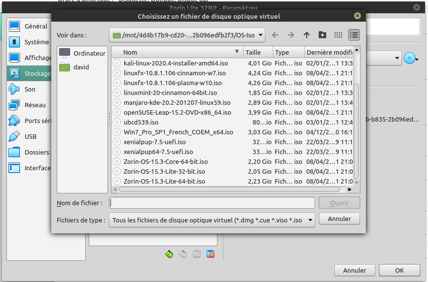 Stockage : J'ai l'habitude de modifier le contrôleur IDE pour aller y chercher l'iso d'installation de Zorin, mais ce n'est pas de mémoire une obligation, le disque étant vide il lui faudra aller chercher un fichier iso.