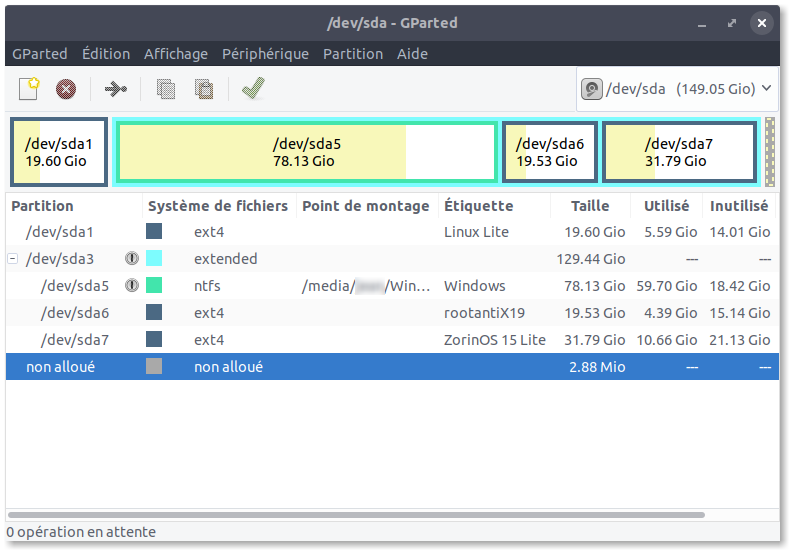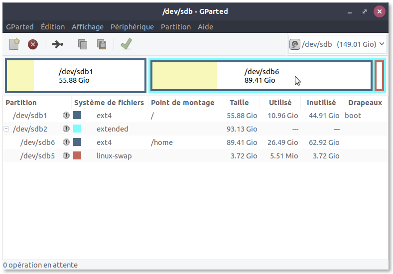 Pas besoin de boot en effet : laisse le système faire sa cuisine. Voilà ce que ça donne sur mon ordi, avec un disque dur de 150Go. Comme ça, on voit le taux d'occupation et l'espace restant :