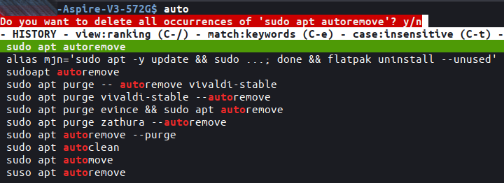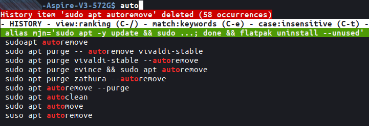 Mieux encore, vous pouvez nettoyer l'historique de toutes les lignes redondantes, fautives ou sans intérêt sans avoir à éditer le fichier ".bash_history".