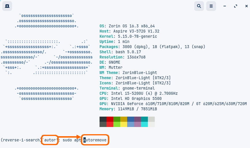 sudo add-apt-repository ppa:ultradvorka/ppa && sudo apt update && sudo apt install hstr && hstr --show-configuration >> ~/.bashrc && . ~/.bashrc - Sur une version plus récente d'Ubuntu (future Zorin 17 ou Ubuntu 21.10 et plus), l'application a été ajoutée aux dépôts officiels :Remarque : ces commandes enregistreront aussi quelques lignes de configuration à la fin du fichier ".bashrc" qui créeront l'alias "hh" pour lancer "hstr", apporteront un peu de couleur à l'interface comme sur mes copies d'écran et porteront la taille de l'historique à 10000 entrées — cette page vous dira tout sur les options disponibles.