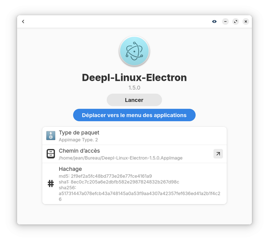 ... puis de la déplacer dans un dossier "AppImages" qu'il créera à la première utilisation dans votre répertoire personnel et d'intégrer son lanceur au menu principal :