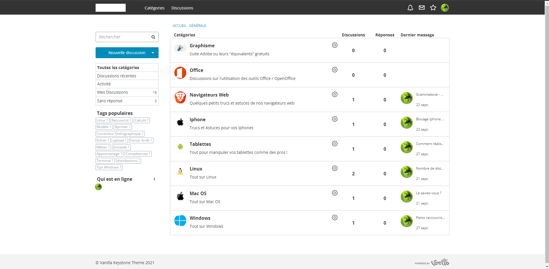 Nous en sommes déjà à jours, mais voici quelques images anonymisées que je peux vous transmettre de l'embryonnaire forum Vanilla que j'ai monté !