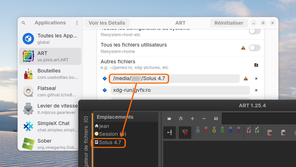 Ceci dit, j'ai trouvé le contournement qui te permettra de te servir pleinement de la version Flatpak d'ART — ou d'une autre application Flatpak qui présenterait le même problème (GIMP, par exemple) : ce serait dommage de se priver de versions plus récentes que celles contenues dans les dépôts d'Ubuntu/Zorin.