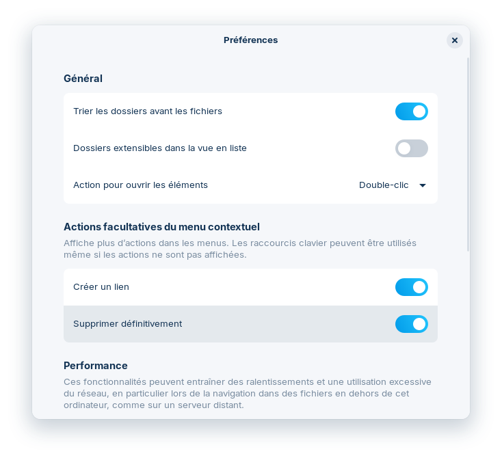 Il faut donc activer l'option "Supprimer définitivement" dans les "Préférences" de Nautilus (menu "Big Mac" trois points) :