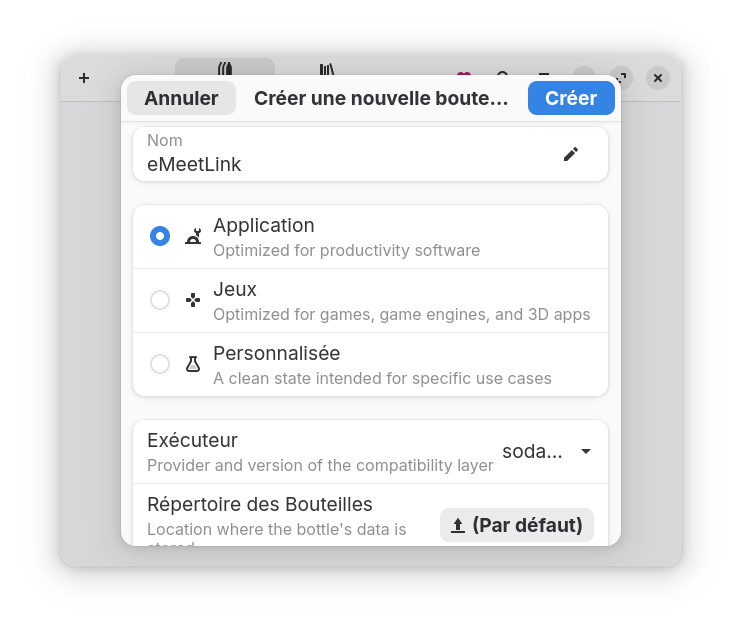 Un clic sur le bouton "Créer une nouvelle bouteille", on entre son nom, on conserve le type "Application", et on clique sur "Créer" :