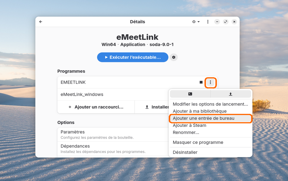 On peut lancer le nouveau programme à partir de "Bouteilles", mais on peut aussi créer un raccourci dans le menu principal.