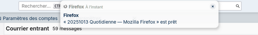 torxxl a écrit : dim. 12 oct. 2025 14:25 Si par exemple, dans Thunderbird, je clique sur un lien, a la place de m'ouvrir Firefox au premier plan, j'ai une notification me disant que Firefox est prêt et je dois cliquer sur son icône pour mettre Firefox au premier plan.